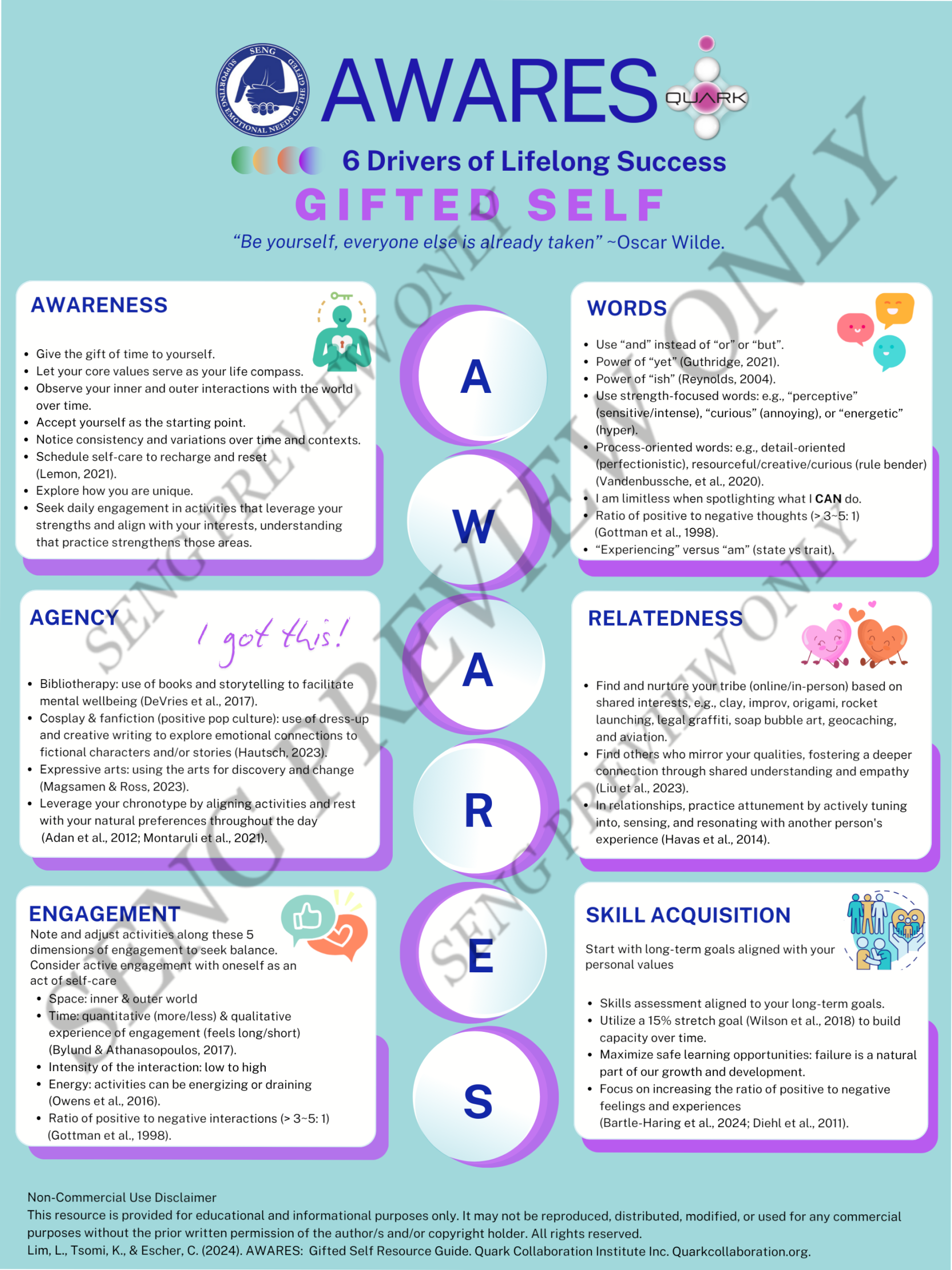 Discover the AWARES, a research-informed highlighting six key drivers of lifelong success (Awareness, Words, Agency, Relatedness, Engagement, Skills) and its application across our family, education, practitioner, and gifted self systems.