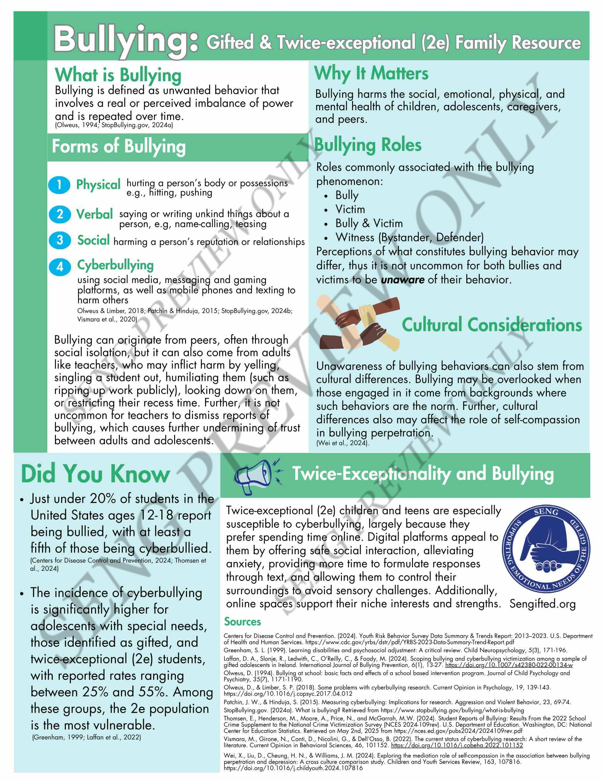 Exclusively available through SENG, this poster provides families with information about identifying and responding to bullying.